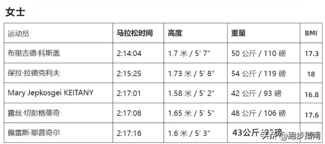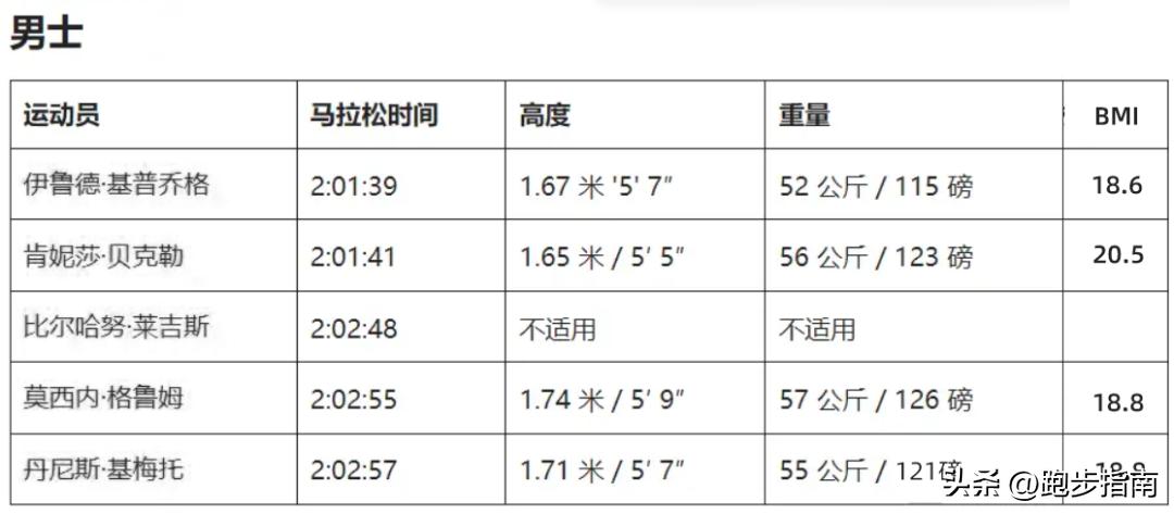 比如,馬拉松之神基普喬格的身高爲1米67,體重52公斤,BMI指數爲18.6。