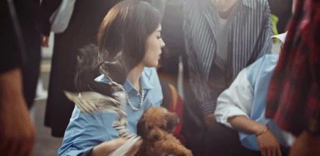 這樣的行爲真的很讓人疑惑。而這個時候女主將絲帶拆下來給小狗包紮,同時還擺動着那一頭飄逸的秀髮,讓人以爲是洗髮水廣告。