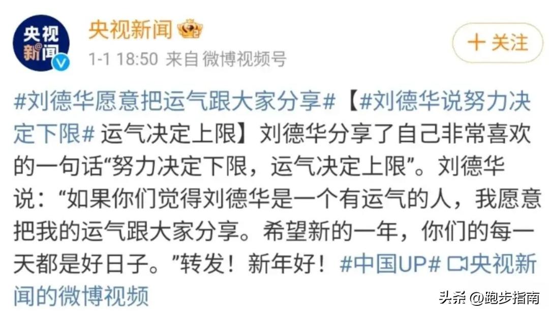 “我有一句話我非常喜歡,努力決定了下限,運氣決定了上限。如果你們覺得劉德華是一個有運氣的人,我願意把我的運氣跟大家分享。希望新的一年,你們的每一天都是好日子。謝謝大家,我是劉德華,新年快樂,身體健康。”