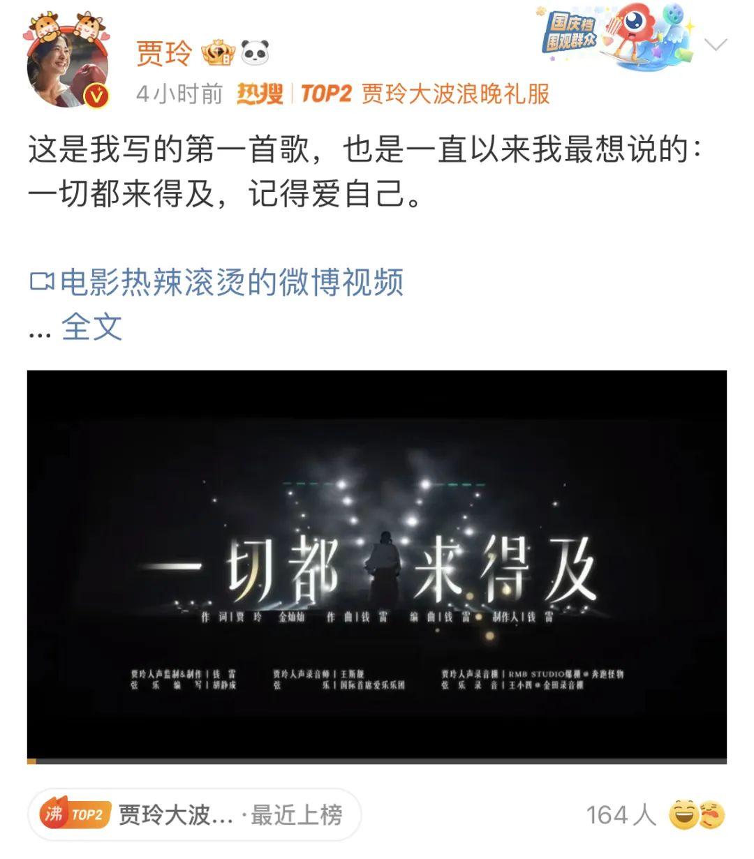 賈玲發文宣傳:“這是我寫的第一首歌,也是一直以來我最想說的:一切都來得及,記得愛自己。”
