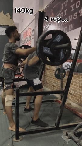 140KG深蹲4次,畫面中好像只看到腿和槓鈴,沒有上肢。