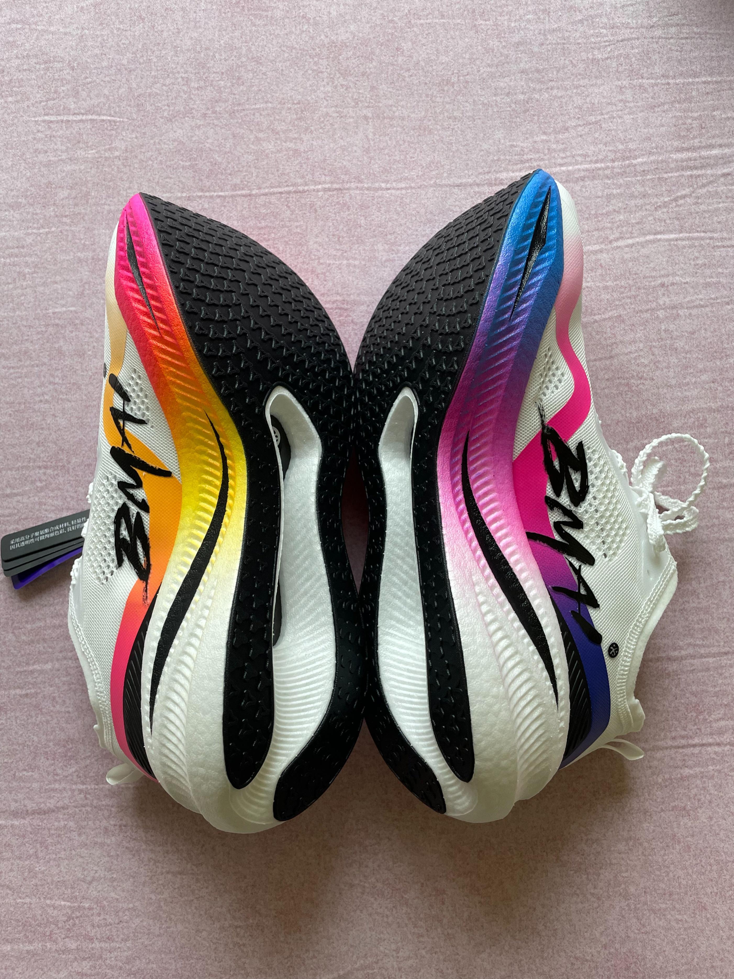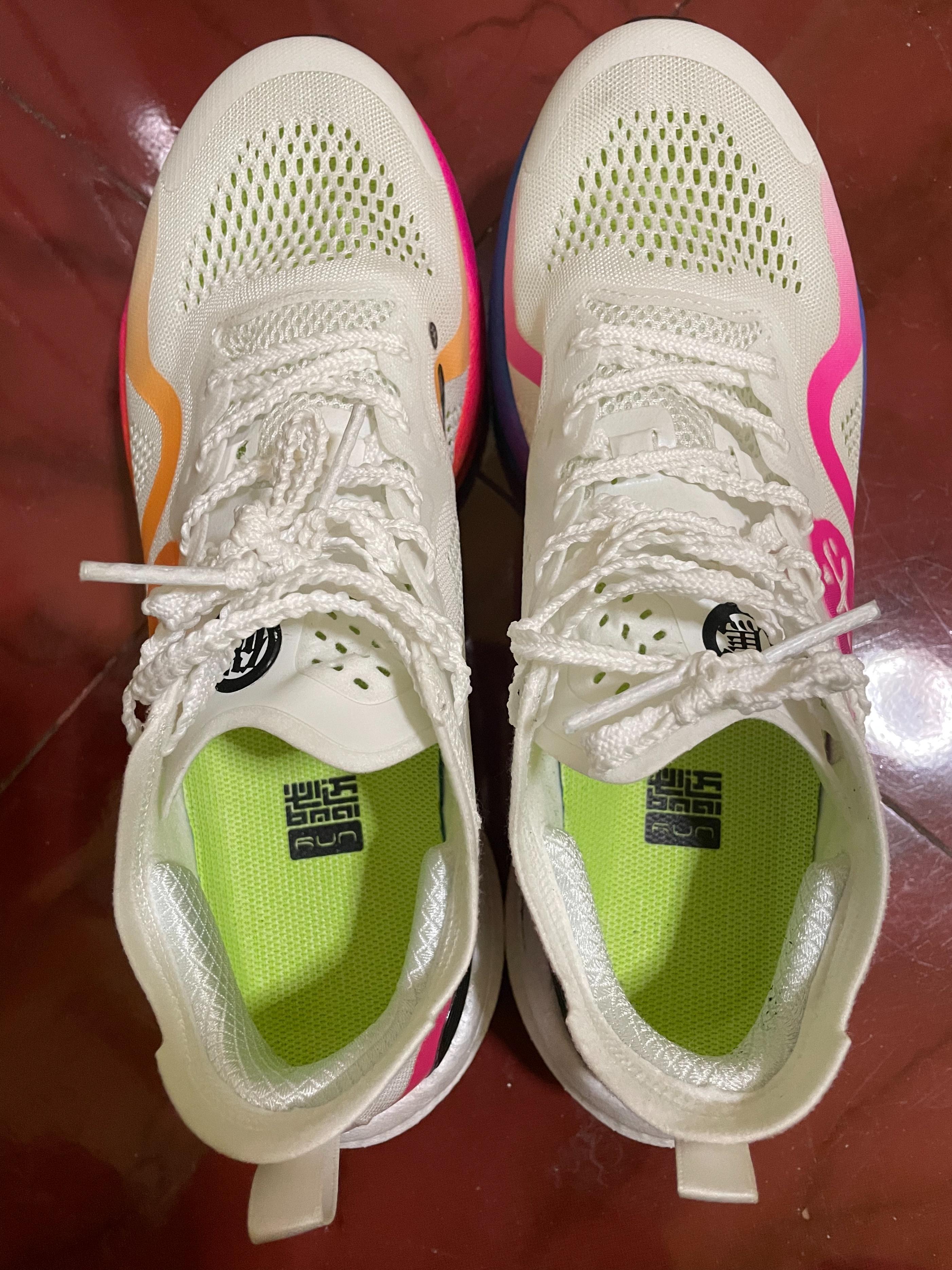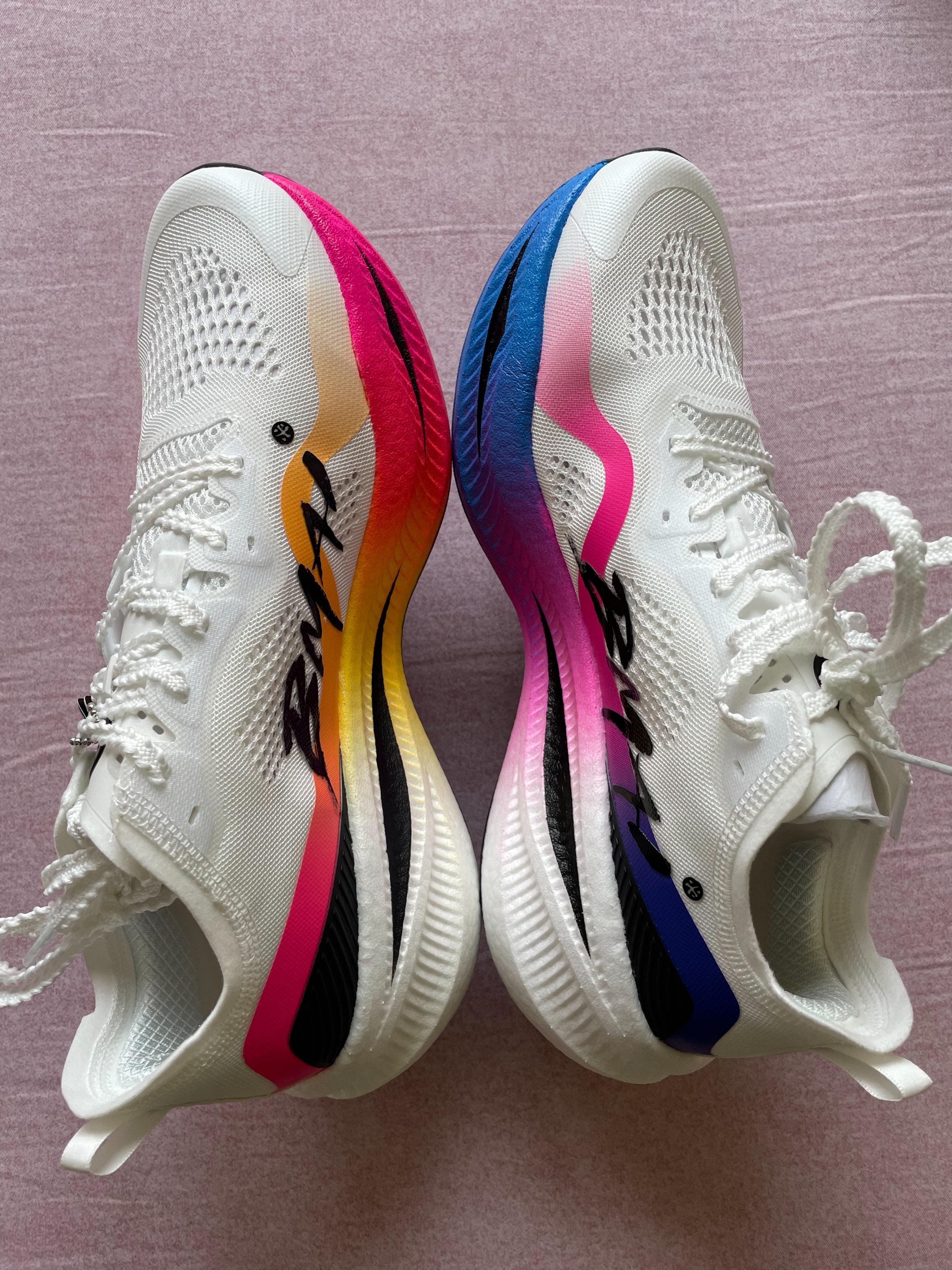 驚碳Fly一出來,我就被它邪魅的顏色吸引,馬上升起搞一雙的念頭。正好最近媳婦結了幾個工程款子,手頭上富裕了400多塊錢,不由分說把錢拍到臉上讓我下單進貨。3月10號到手,當天就忍不住穿上跑了個10公里的放鬆跑,昨天又跑了節間歇課,對這雙鞋有了初步的瞭解,向各位老闆彙報一下。