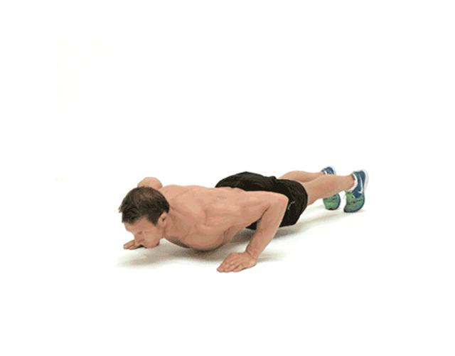 俯臥撐的標準動作是俯臥,身體保持平直,腰腹收緊,以兩手掌和兩腳趾爲支點,然後用肩臂和胸肌發力,雙手撐起,做臂屈伸動作讓全身同時上抬,至雙臂伸直,此時肌肉高度緊張。然後再還原動作繼續進行。