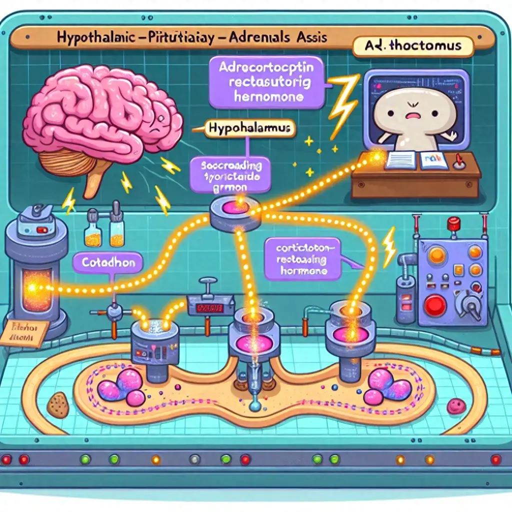我們感覺到壓力時,我們的下丘腦分泌促腎上腺皮質激素分泌激素(CRH),然後垂體釋放促腎上腺皮質激素(ACTH),ACTH再作用腎上腺。這三個器官的相互作用被稱爲下丘腦 - 垂體 - 腎上腺軸,或HPA軸。