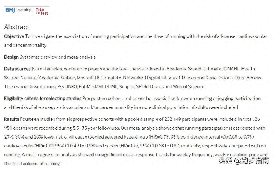 澳大利亞維多利亞大學的研究人員發表在《英國運動醫學雜誌》的研究揭示,每週僅跑步一次,每次不超過50分鐘且速度低於8公里/小時,即可帶來顯著健康益處。研究人員對23萬人的14項研究綜合分析發現,無論性別,跑步者的死亡風險比不跑步者低27%。
