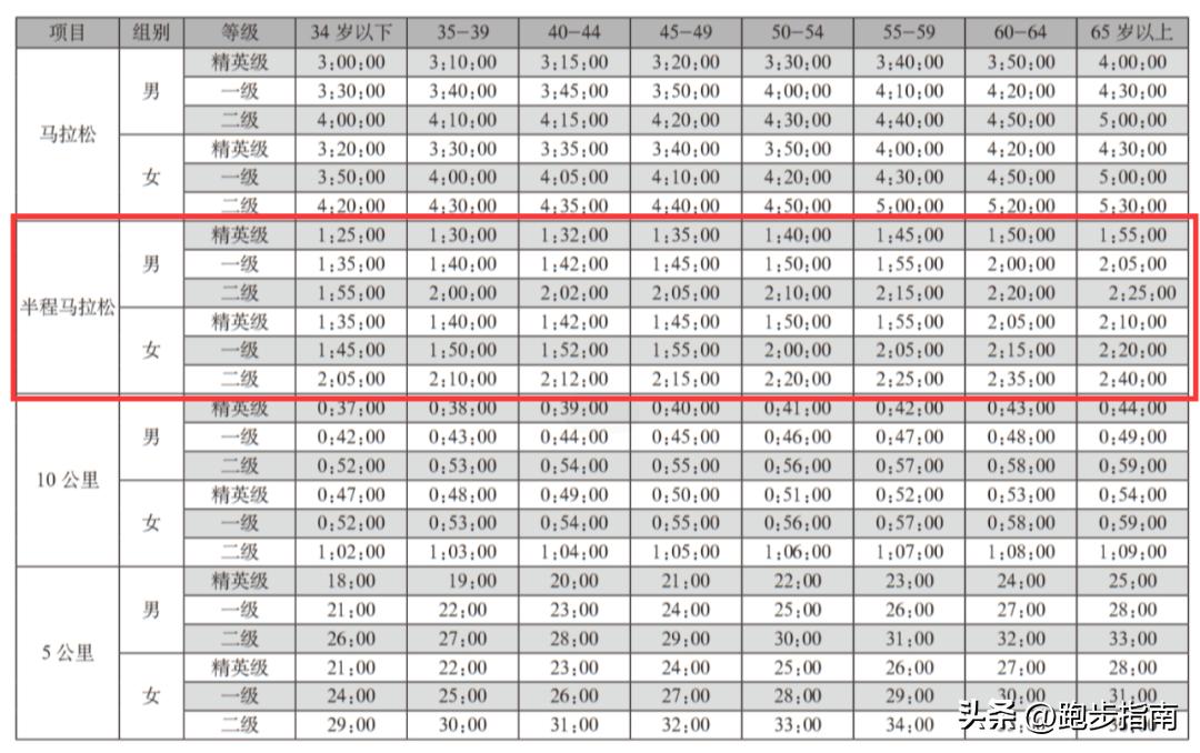 根據最新發布的《中國田徑協會路跑賽事大衆選手等級評定實施辦法》,我們可以看到:35-39歲男性半馬二級剛好是2小時,年齡更大的組別都是超過2小時的。而女性半馬二級所有組別均在2小時開外,34歲以下2小時5分就能達到二級。