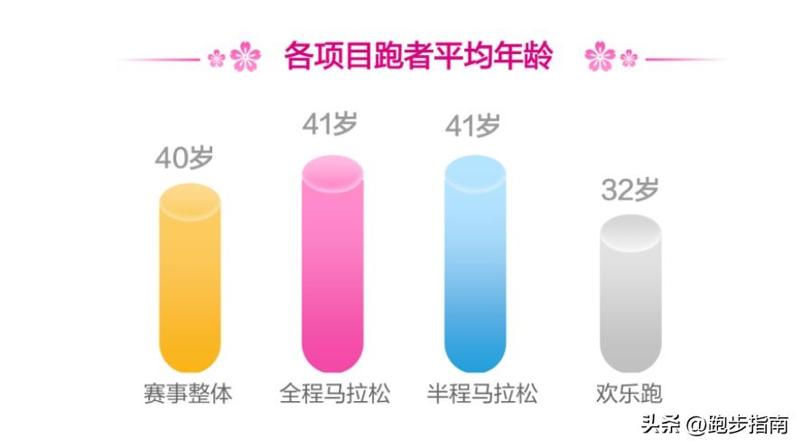 以2024年無錫馬拉松爲例,參賽者整體平均年齡爲40歲。各項目中,全程和半程馬拉松項目跑者平均年齡均爲41歲,歡樂跑跑者平均年齡32歲。