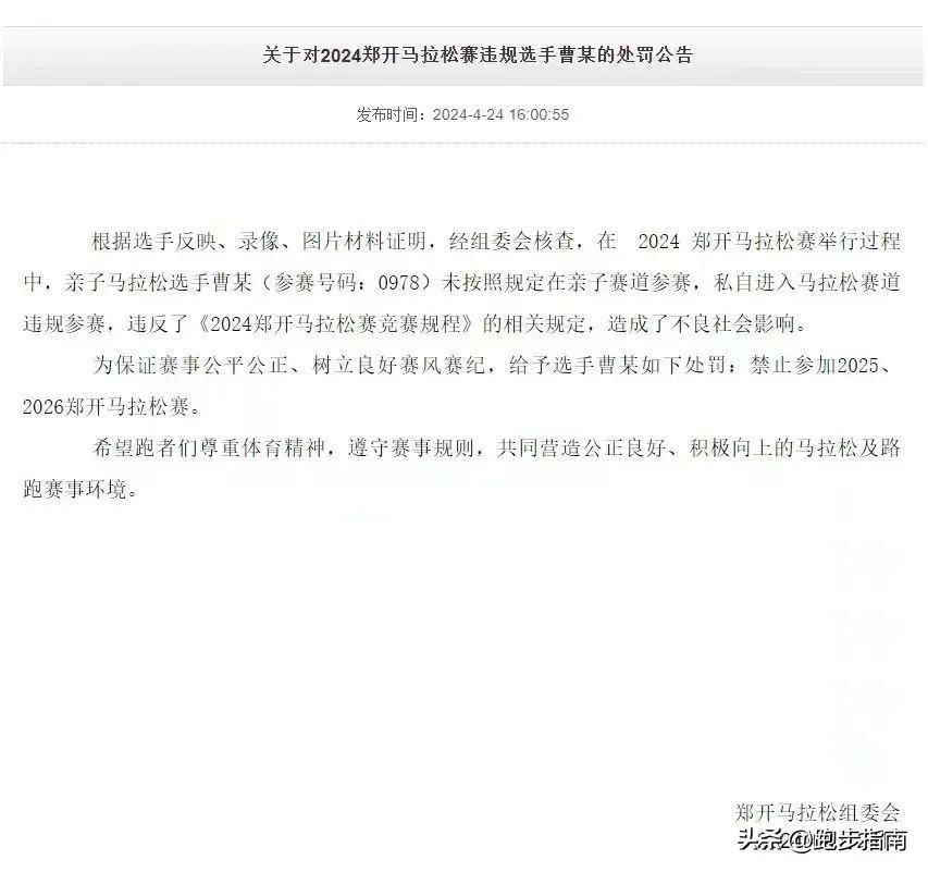 面對輿論的質疑和關注,鄭開馬拉松組委會對曹先生的參賽行爲進行了調查。結果顯示,曹先生未遵守親子賽道的參賽規定,擅自進入馬拉松賽道,違反了《2024鄭開馬拉松賽競賽規程》的相關條款。因此,組委會決定對曹先生實施紀律處分,禁止其參加2025年和2026年的鄭開馬拉松賽,爲期兩年。