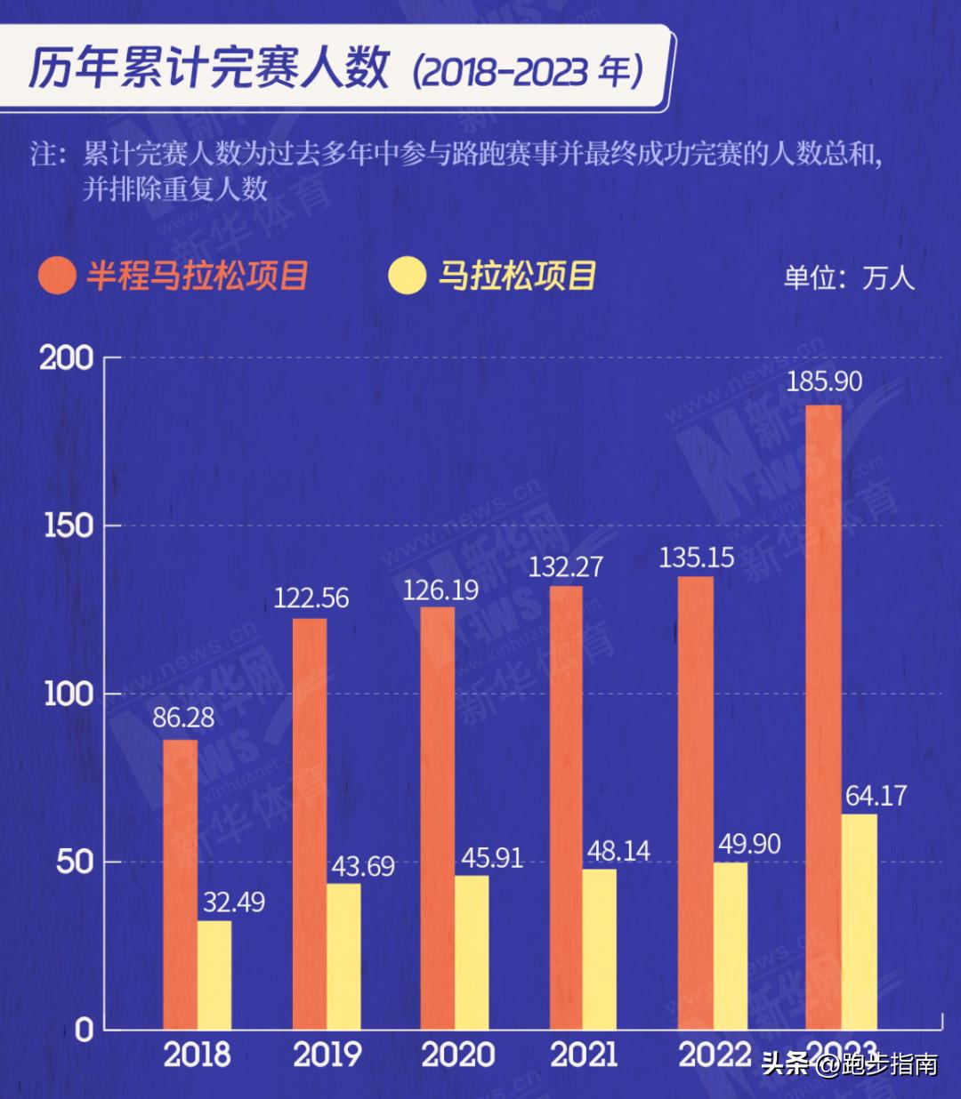從2018年至2023年,馬拉松和半程馬拉松的完賽人數均呈現出逐年上升的趨勢。具體而言,馬拉松項目的累計完賽人數已高達64.17萬人,而半程馬拉松的累計完賽人數更是達到了185.9萬人。