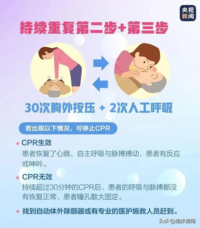 具體方法是讓患者平躺在堅硬的地面上,解開其衣領,對其胸部進行按壓,同時進行人工呼吸。按壓的頻率建議爲每分鐘100-120次,每按壓30次後進行兩次人工呼吸。