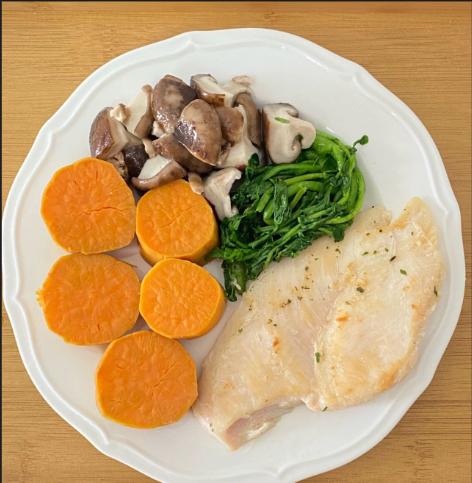 週五:一塊雞胸肉+一拳頭雙孢菇+一拳頭青菜+一小個紅薯