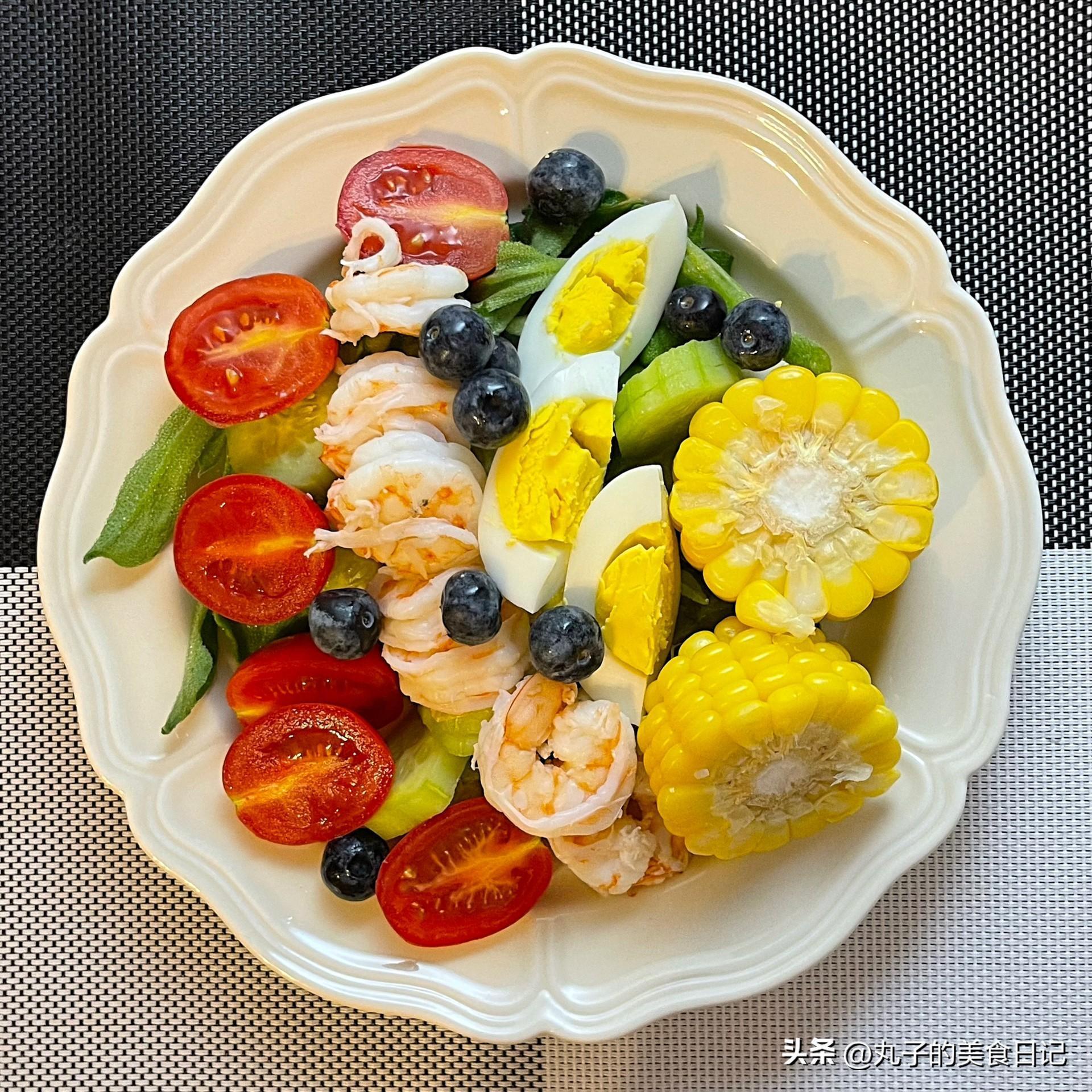 週一:80g水煮蝦+一顆水煮蛋+150g黃瓜+半根玉米+幾顆聖女果+藍莓