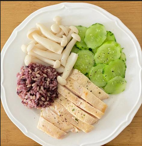 週三:一塊水煮雞胸肉+一拳頭菌菇+半根黃瓜+半拳頭雜糧飯