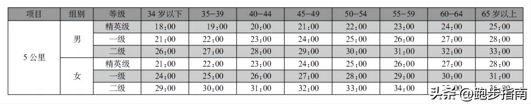 中國田徑協會路跑賽事大衆選手等級5公里標準: