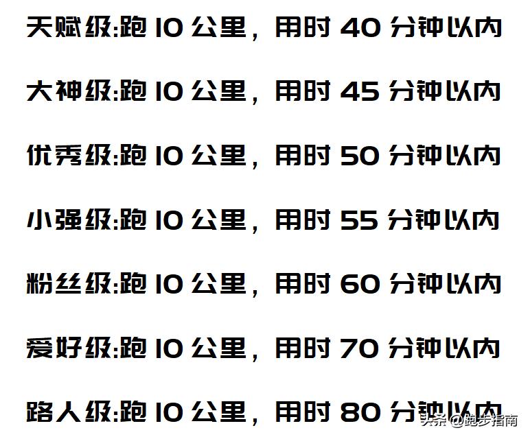 跑步成績的劃分一般從非常初級到頂尖級別,逐步遞進,每個等級的劃分都有其科學依據。初學者通常可以在1小時內完成10公里,而一位頂尖的跑者可能只需要30分鐘甚至更短。