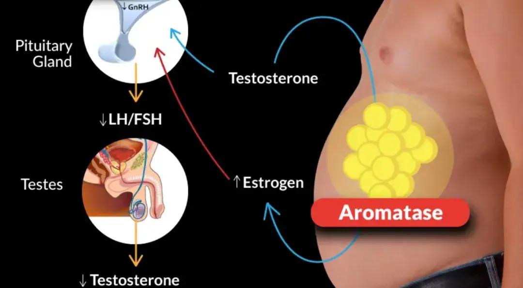 肥胖使男性芳香化酶水平升高,睾酮被不可逆地轉化爲雌二醇,導致雌激素水平升高,而現代人的肥胖問題變得很普遍。