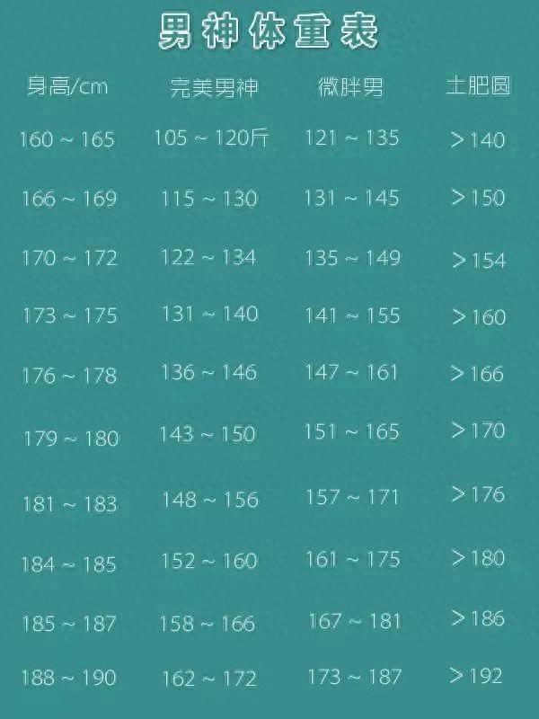 我們可以看到170cm的男性,體重在120-130斤之間是標準的,身高180cm的男生,體重在145-150斤左右是標準的。