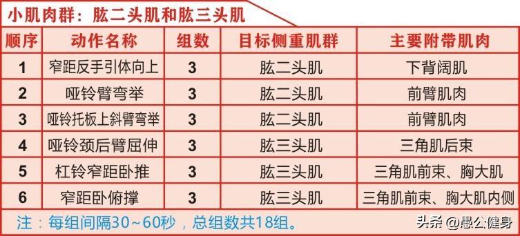 而小肌羣,如肱二頭肌、肱三頭肌和肩部肌肉等。可以每週進行3次訓練。其它肌羣,包括腹肌、核心肌羣等,同樣建議每週可進行2到3次的訓練,以提升運動表現和姿勢控制。這些小肌肉羣在兩次訓練之間應至少要有經過一天的休息間隔時間。