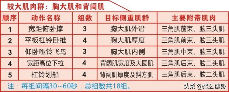 較大肌肉羣,如胸肌和背肌等。建議每週進行2到3次訓練就可以了,這樣也能獲得足夠的恢復時間。一般上肢伸肌羣也會隨同胸大肌同時練到;而上肢屈肌羣則會隨同背肌同時練到。練胸的動作如臥推等;練背的動作如槓鈴划船等動作,練一次一般間歇2~3天再重複進行。