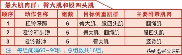 最大肌肉羣,爲身體部位中的最大肌羣,指腿部和臀部肌肉。建議每週可進行1到2次訓練,以確保給予足夠的刺激和恢復時間。一般臀腿是一起練的,如負重深蹲等動作,練一次一般間歇3~4天再重複進行。