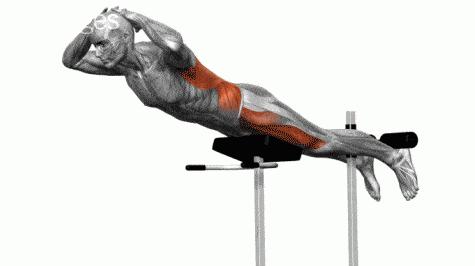 動作標準:俯臥在訓練凳上,雙手交叉置於胸前,雙腳着地。隨後,用力收縮下背部和臀部肌肉,將上半身和雙腿同時抬起,形成一個優美的弧線。動作進行15次,重複4組。