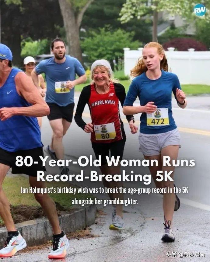 在馬薩諸塞州的 Great Bear Run 5km比賽上,一位剛過完80歲生日的奶奶Jan Holmquist刷新了80歲年齡組的5公里紀錄,用時24分08秒,平均配速4分49秒。