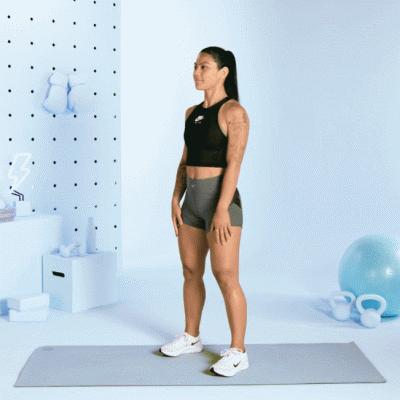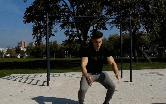 這個動作是深蹲跟跳躍的結合,跳躍的時候要收緊腹肌,利用爆發力往上跳。