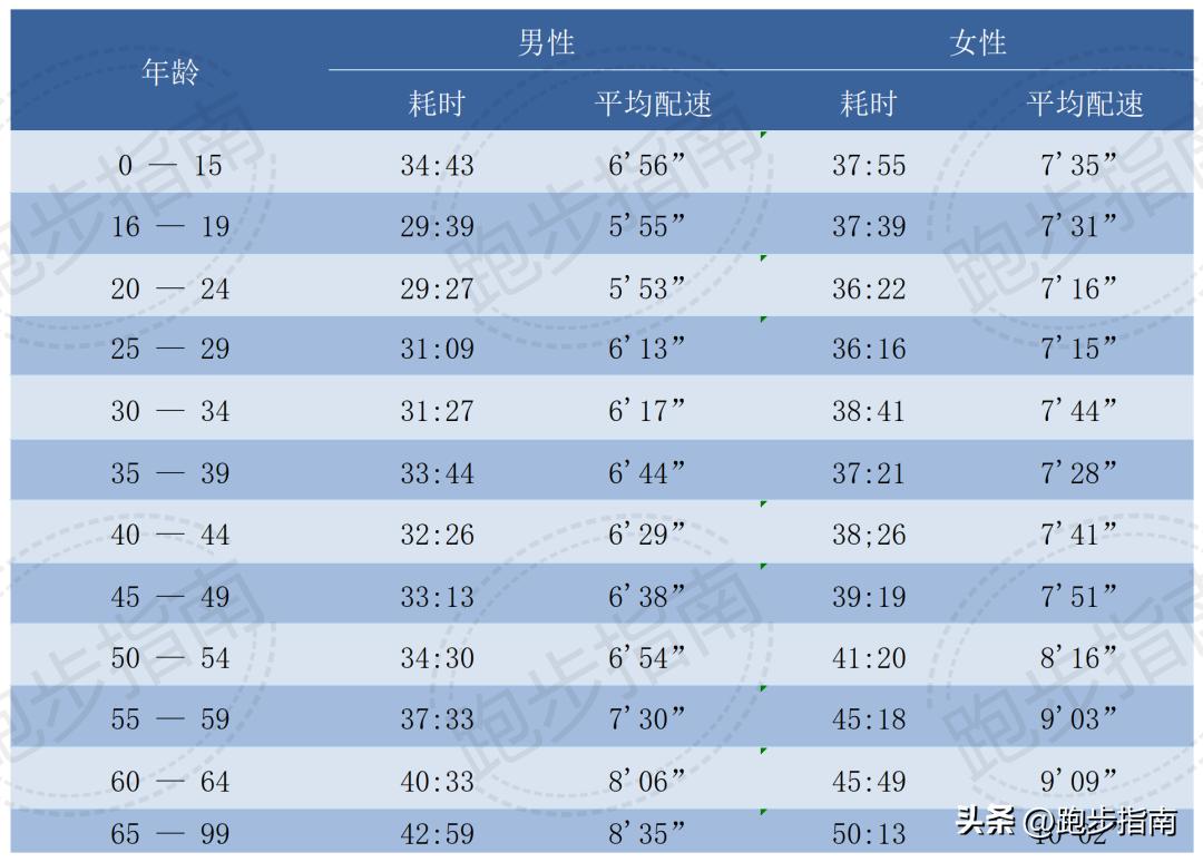 不同年齡段的跑者在5公里跑步上的表現顯然不同。下面我們來看一張各年齡段跑者完成5公里所需時間的表格,看看大衆跑者需要多少用時。