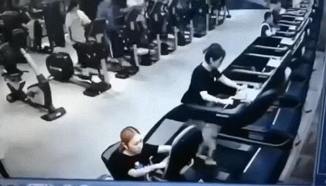 視頻中一女子帶着小孩在跑步機上跑步,不知道是不是操作錯誤,還是其它什麼原因,跑步機越來越快。只見前面的小孩先摔倒,隨後女子也摔倒,兩人都被跑帶給甩出。