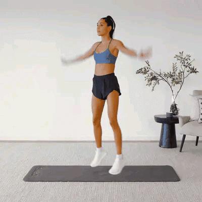 動作1. 開合跳:雙腳併攏站立,雙手放在腰間,然後雙腳向外跳躍並分開,同時雙手向兩側展開,再迅速跳回原位。這個動作可以快速提高心率,燃燒脂肪;