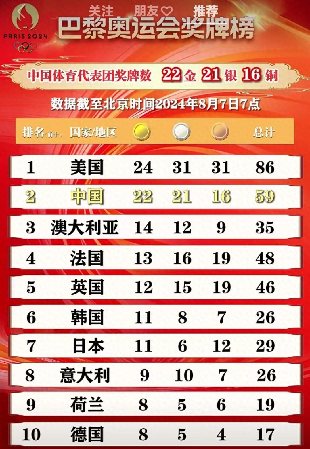 巴黎奧運金牌榜,截至2024年8月7日7時