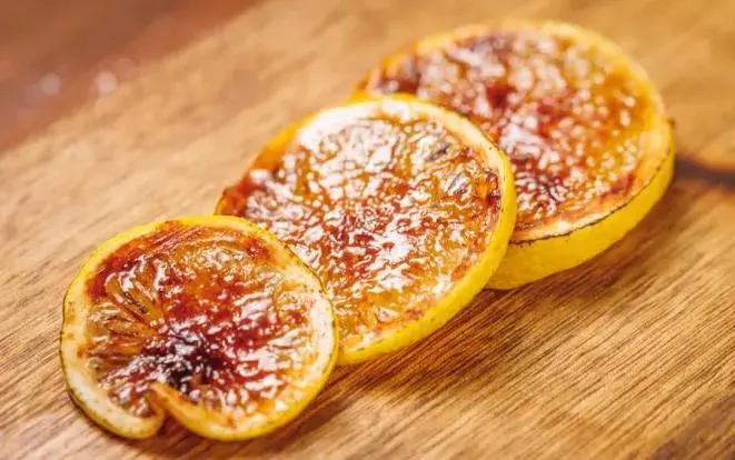 製作過程很簡單:將新鮮的檸檬切成儘可能薄的片,撒上一層咖啡粉,然後用噴槍炙烤,直到咖啡粉融化。