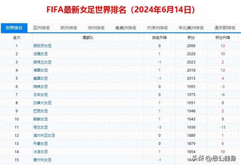 #女足世界排名#截止2024年6月14日,根據國際足聯(FIFA)最新公佈的女子足球的世界排名,其中前10位排名結果如下:1.西班牙;2.法國;3.英格蘭;4.德國;5.美國;6.瑞典;7.日本;8.加拿大;9.巴西;10.朝鮮。