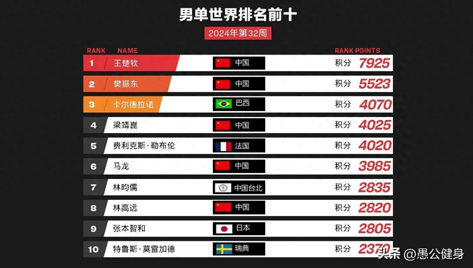 世界乒乓球男單頂尖選手,最新前十名的積分和排名分別是:
