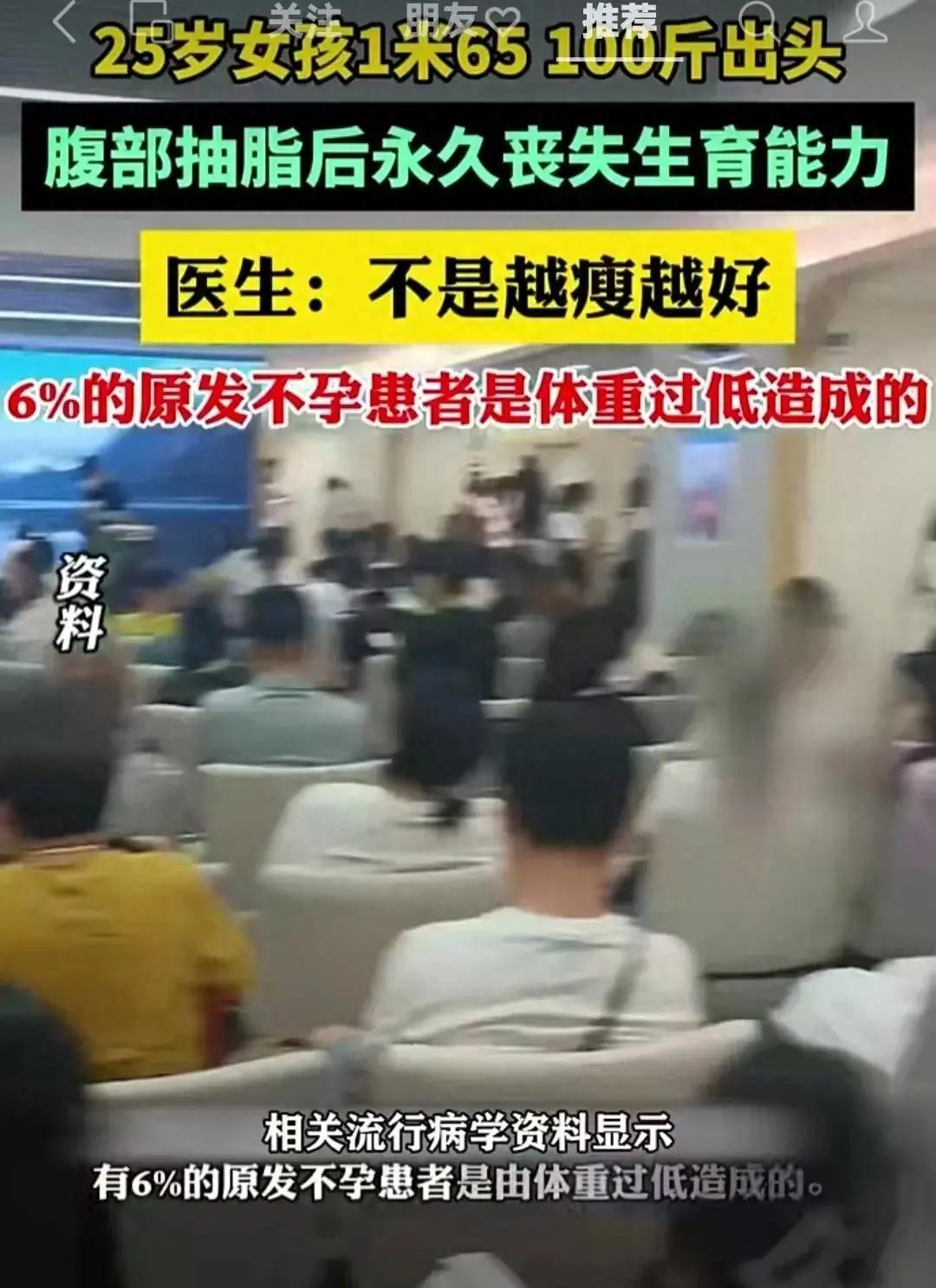 這是最近看到有媒體報道說:一位25歲女孩,身高1.65米,體重100斤出頭,腹部抽脂後永久失去喪失生育能力。看完後只想說,真的沒有這個必要。只要身體健康,胖一點沒有關係。