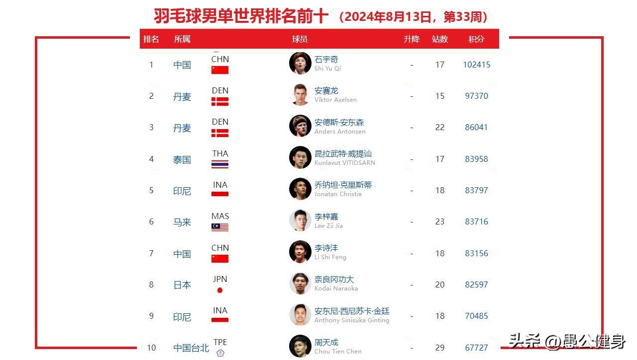 而在國際,根據2024年8月13日,第33周國際羽聯頒佈的最新男子排名,羽毛球男單世界排名前十位的選手分別是: