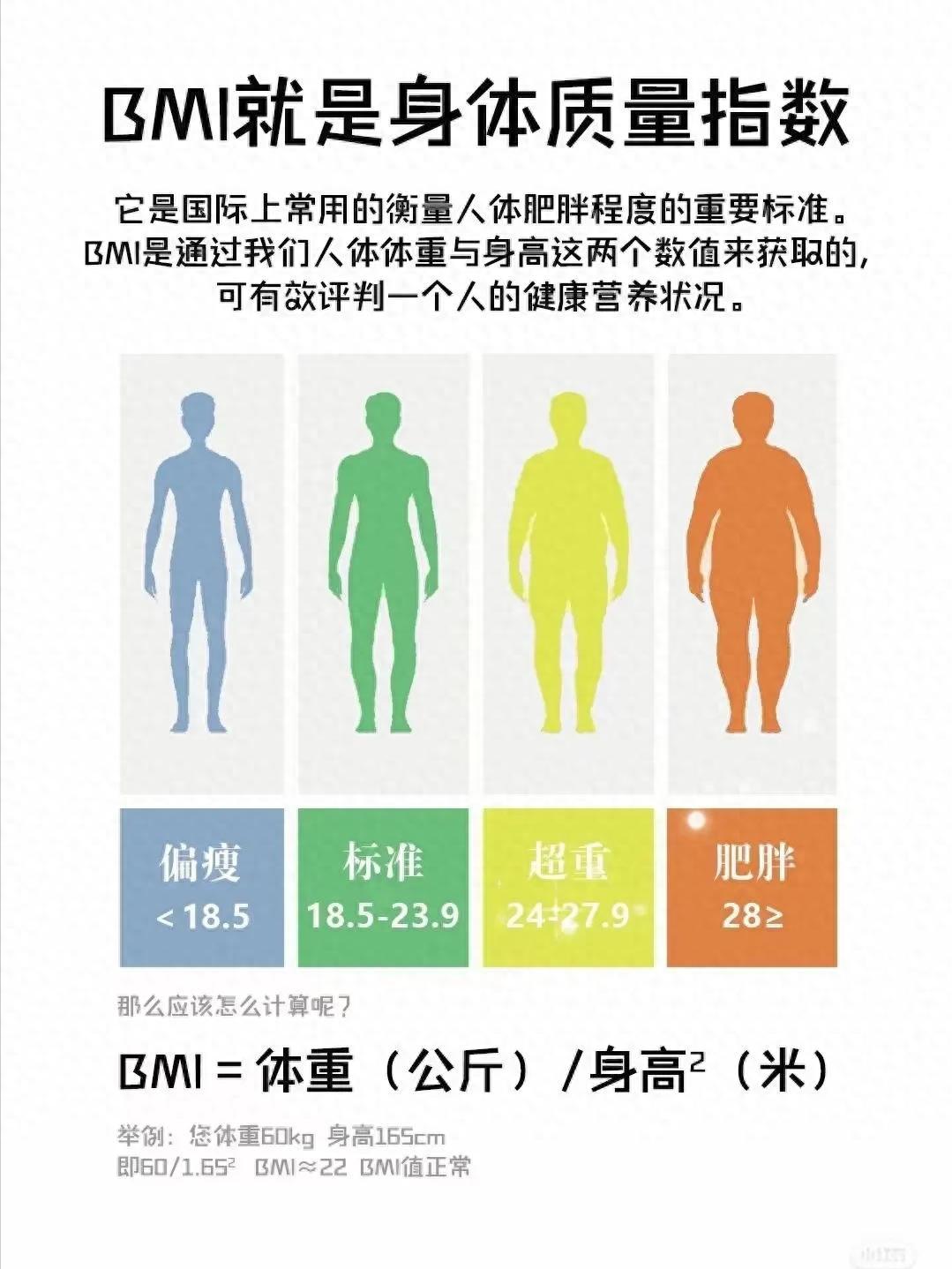 BMI(身體質量指數)=體重(kg)/身高(m)的平方,如果BMI在18.5-23.9之間,這屬於標準體重範圍,如果BMI超過24,則意味着超重,BMI超過28,則意味着你身材肥胖了,需要進行減肥。