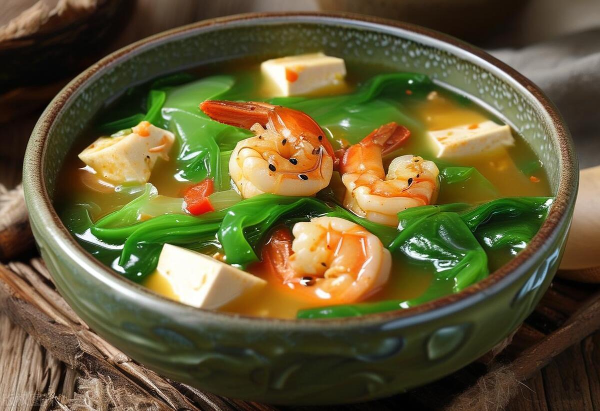 海帶,富含碘元素,調節甲狀腺功能,有助於調節新陳代謝。豆腐口感軟化,富含植物蛋白。蝦仁,鮮嫩可口,富含優質蛋白質和多種微量元素。