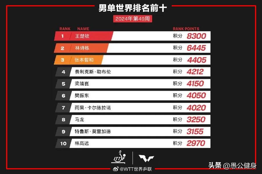 這就是2024年第49周男子乒乓球世界排名的情況,十大高手是否如你所料呢?