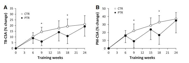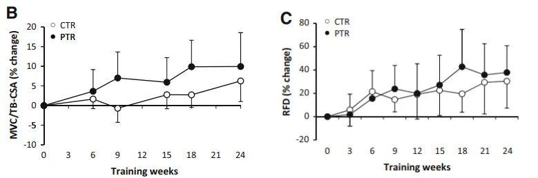 但結果還不止於此。反差在於,雖然24周以後,兩者的肌肉橫截面維度類似,但練6休3的週期性停練組增力效果要顯著優於連續訓練組。無論是1-RM力量還是最大自主收縮能力(MVC),停練組比連續組都具有明顯優勢。