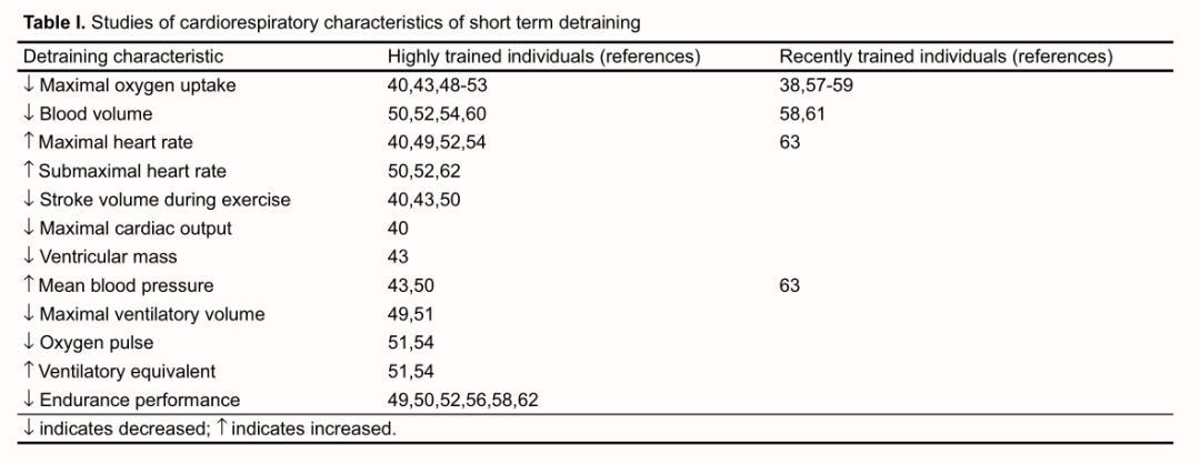 一般停止訓練2到4周(短期停練)後,最大攝氧量、最大心率、血容量、心臟輸出功率都會明顯下降。