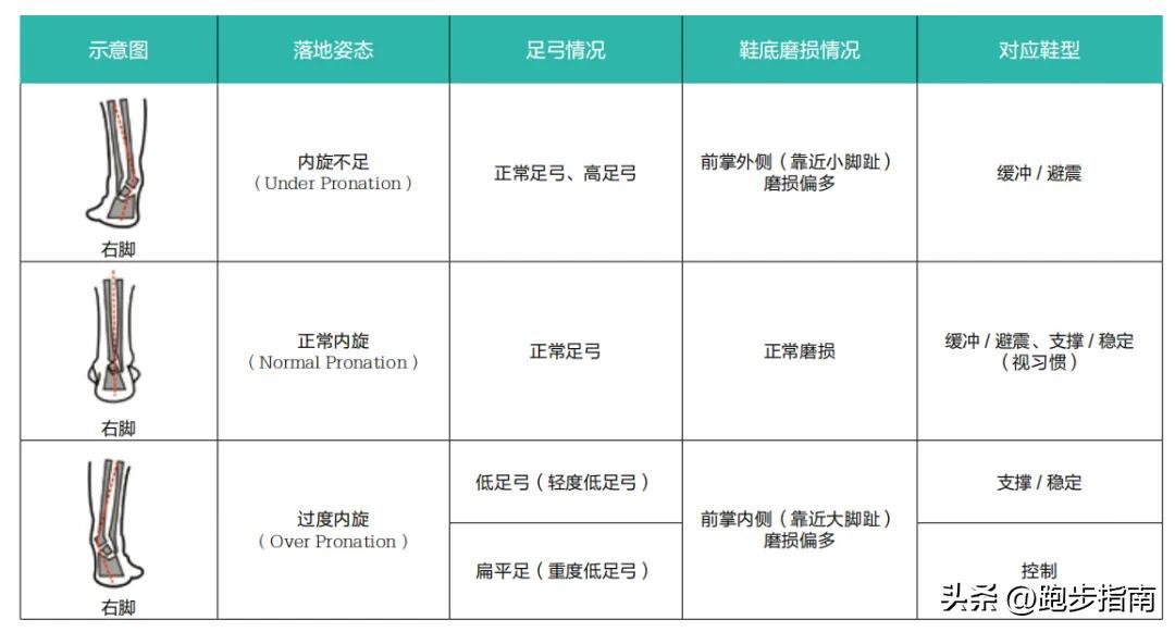落地姿態主要包括內旋不足、正常內旋和過度內旋三種。內旋不足又稱爲外翻,跑步時腳部內旋度不夠,容易增加受傷的風險,特別是在長距離奔跑時。