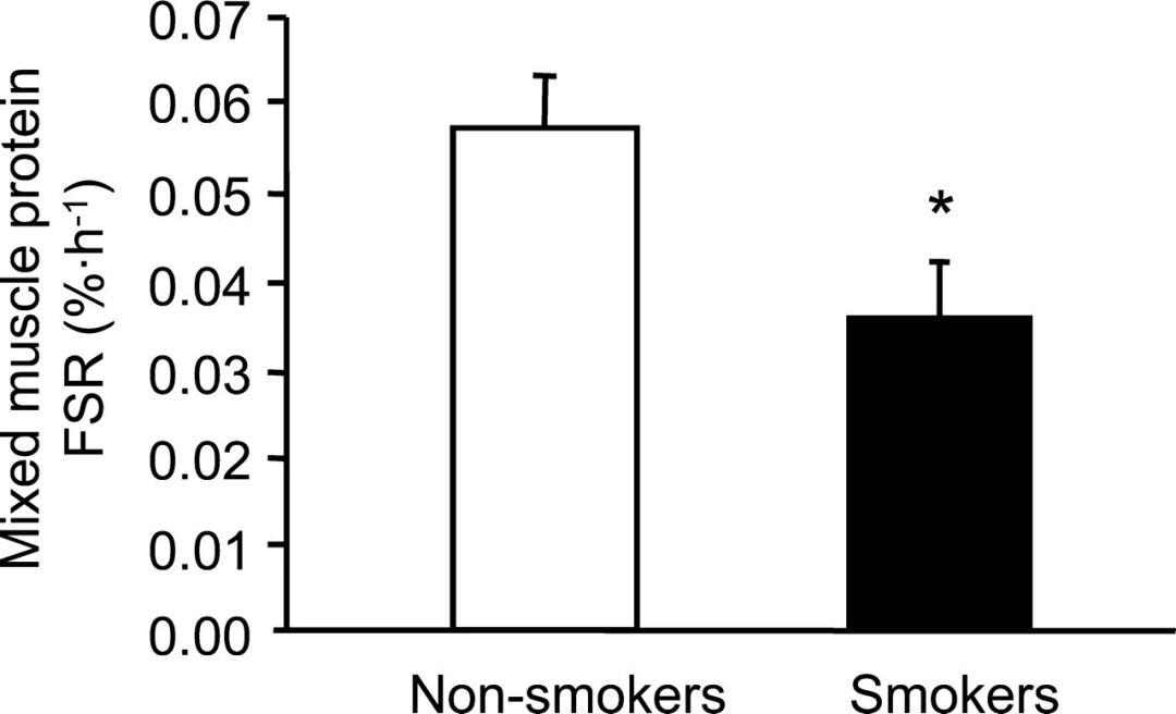 因此兩組人雖然體內亮氨酸水平(原料)相仿,但是肌蛋白合成速率有明顯差異,上圖左側爲非吸菸者,右側爲吸菸者,兩者的肌肉蛋白合成率相差37%。