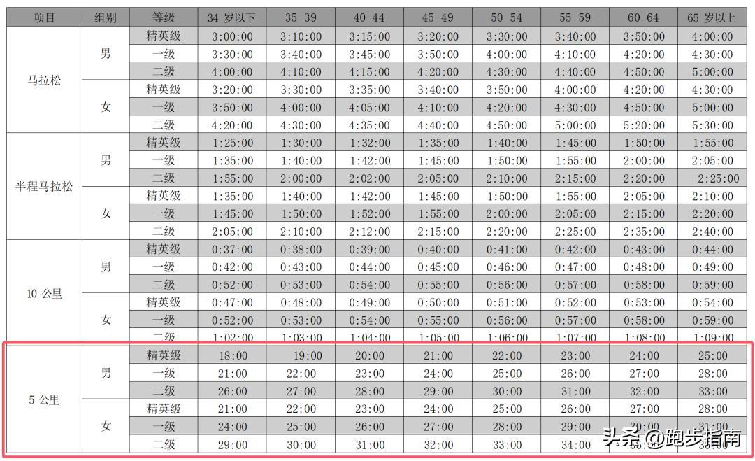 中國田協也出了一份大衆跑者的5公里跑步等級劃分表,可以看到無論男女能跑進25分的基本都可以在表上找到自己的位置。