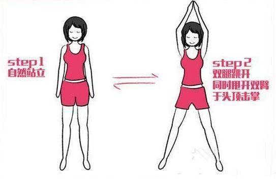 開合跳,也是公認減脂最快的動作,每次只需要15分鐘,就能達到慢跑40-45分鐘的效果。開合跳可以鍛鍊身體絕大部分的肌羣,快速提升心率,使能量消耗大大增加,從而刺激脂肪的燃燒,達到減肥效果。