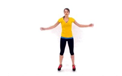動作標準:站立狀態,跳躍的時候打開雙腿,向外站姿,然後雙手向頭頂,再次跳躍,恢復站立姿勢。動作進行30秒,重複4組。
