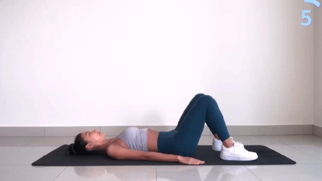 仰臥在瑜伽墊上,雙腿屈膝立足,雙足位於膝蓋下方,雙手位於身側,然後臀部發力,將小腹頂起,讓肩部、小腹、膝蓋位於一條直線,動作堅持30秒,休息20-30秒,然後進入下一個動作。