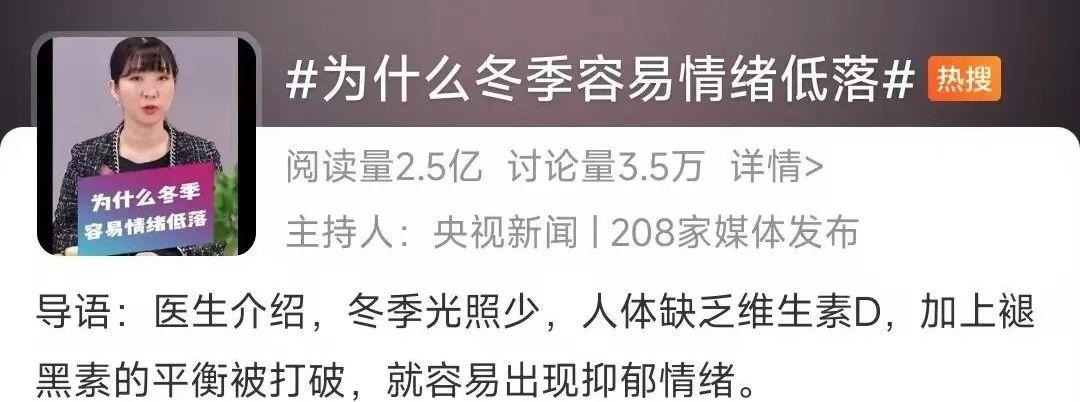 同樣,現在我們已經進入深冬了,天氣寒冷再加上白天曬太陽的時間變短,心情不好是很常見的事兒。