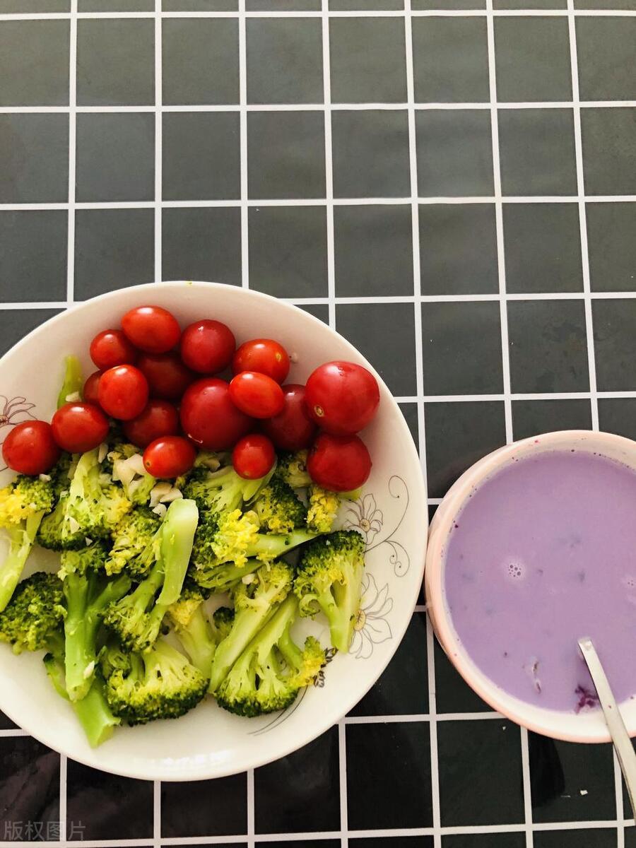 早餐:一顆荷包蛋+2片全麥麪包+一杯無糖豆漿+一把聖女果