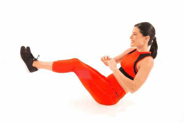 坐姿狀態,雙腿微抬,雙手微握拳,保持平衡狀態,然後進行左右轉體,感受腹部肌羣的受力。